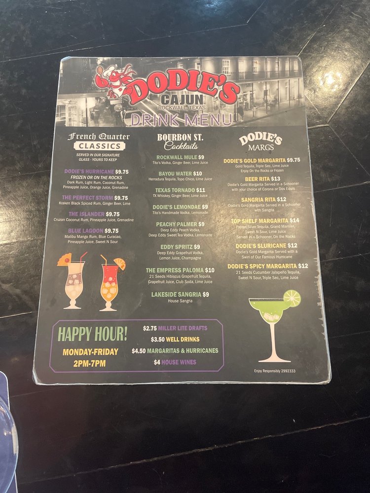 Introducing the menu at Dodie's Cajun Diner at The Harbor, a beloved Cajun/Creole restaurant in Rockwall, TX, with a stunning lakefront view. Known for its first-rate Creole cooking, the highlight dishes include the chargrilled oysters Dodie and the flavorful Dodie Pasta Monica, featuring shrimp, crawfish, and parmesan cheese sauce. The red beans and rice with grilled andouille sausages are a must-try, complemented perfectly with Crystal Hot Sauce. The restaurant also offers a special mild mixer for a delicious Bloody Mary. With attentive service, a full bar, and outdoor seating overlooking the lake, Dodie's is a perfect spot for dinner, happy hour, or special occasions. Despite past service issues, the newer management team has resolved them, ensuring a delightful dining experience. Don't miss the opportunity to savor authentic NOLA cuisine at Dodie's Cajun Diner at The Harbor.